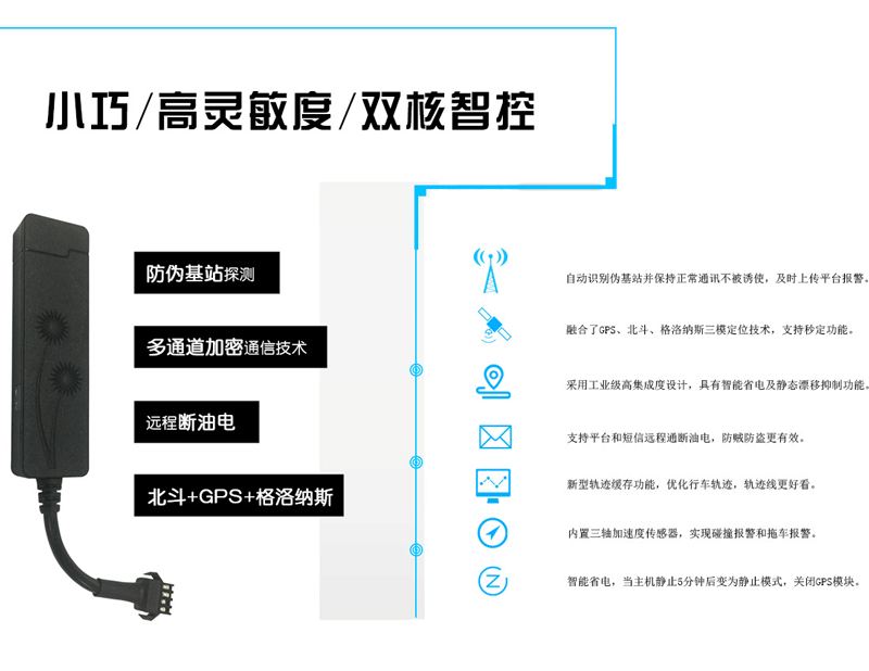 车载定位终端GT808是一款双核智控、体积小巧、高灵敏度、融合了GPS、北斗、格洛纳斯三模定位技术支持秒定功能的产品。适用于金融信贷、汽车租赁等行业。
